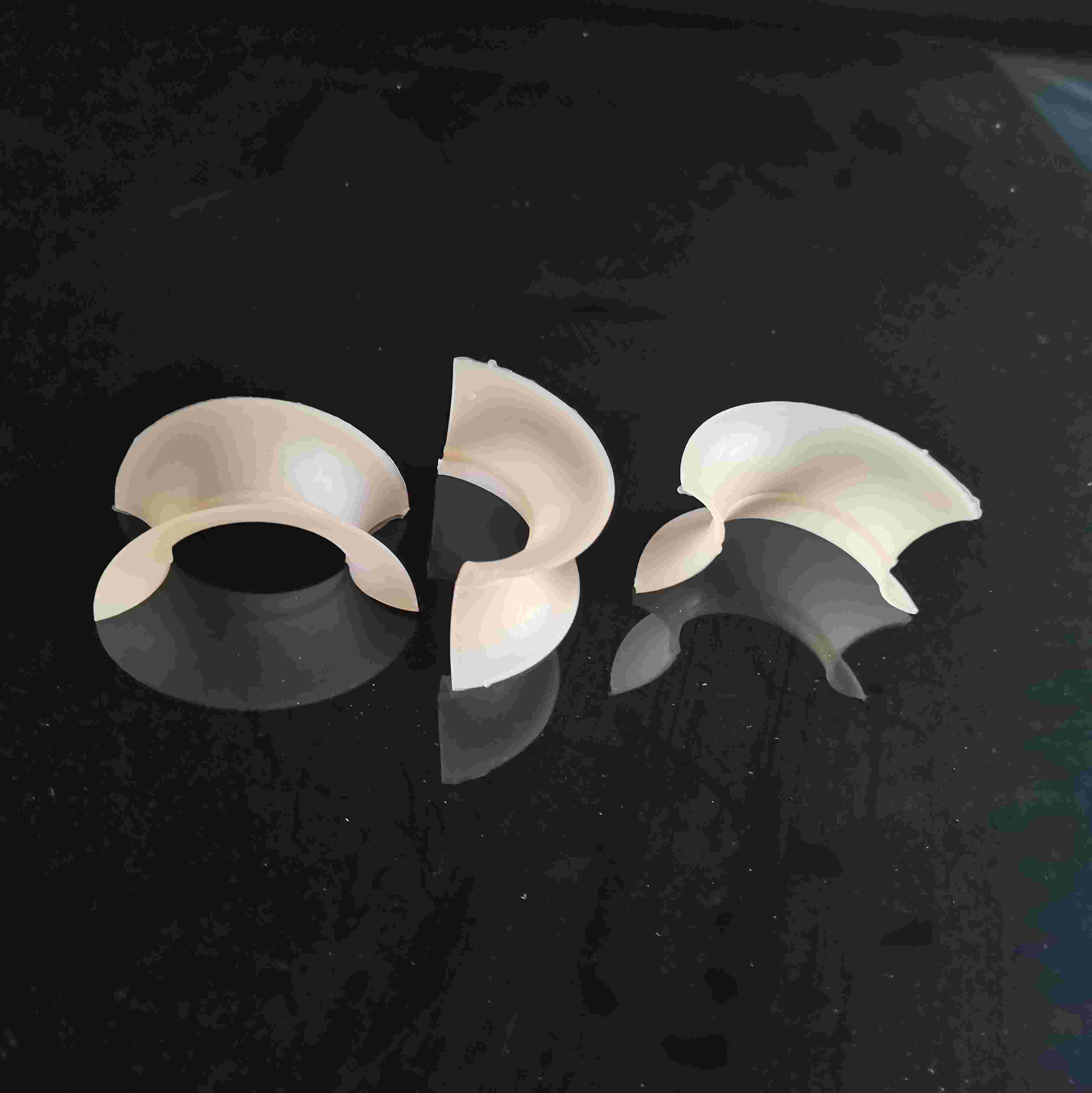 塑料矩鞍環(huán)填料對矩鞍環(huán)填料的改進(jìn)是通過在鞍背上開孔,扇形弧面加工成貝殼鋸齒邊緣,使流道更加暢通,致使填料的單元匯聚點(diǎn)增多,所以提高了它的綜合性能。